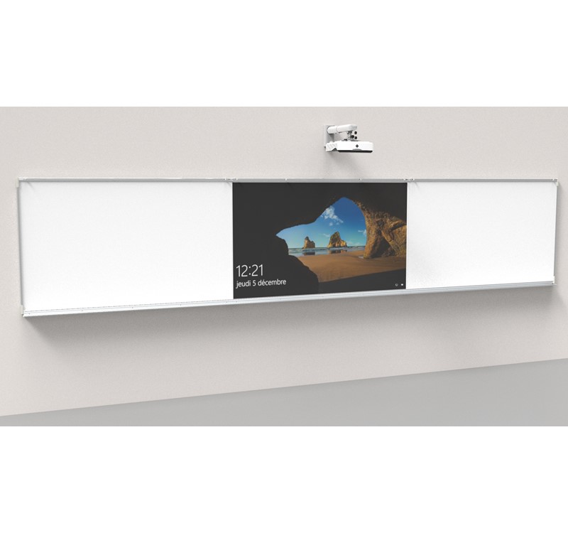 PROJECTION ET ÉCRITURE : Cet ensemble combine une surface centrale de projection de 2 m à deux surfaces d'écriture et d'affichage latérales. En émail blanc projection, les trois surfaces offrent un confort visuel maximal lors de la projection avec de reflets limités et l'effaçage s'effectue à l'aide d'un chiffon humide.