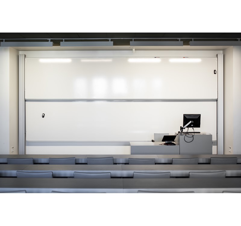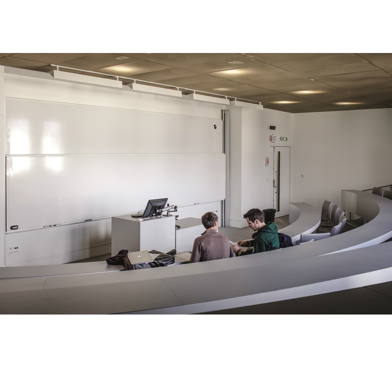 Le tableau Va-et-Vient Leader comprend 2 surfaces en acier émaillé, adapté aux salles de grandes capacités tels que des amphithéâtres. Par commande manuelle, les surfaces coulissent simultanément le long de deux pylônes, permettant de les positionner à la hauteur souhaitée.
