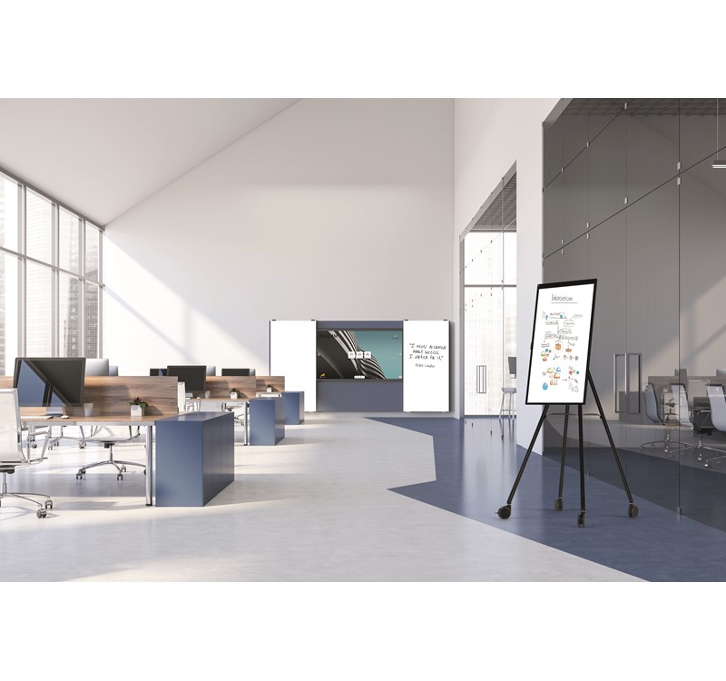 Le tableau à panneaux coulissants offre un système spectaculaire à deux niveaux, doté d’une fixation murale invisible et de roues en caoutchouc garantissent un coulissement silencieux. Grâce à sa conception flexible, cette solution dynamique permet de jouer avec les couleurs et d’intégrer parfaitement la technologie telle que les écrans LCD tactiles en facilitant la gestion des câbles.