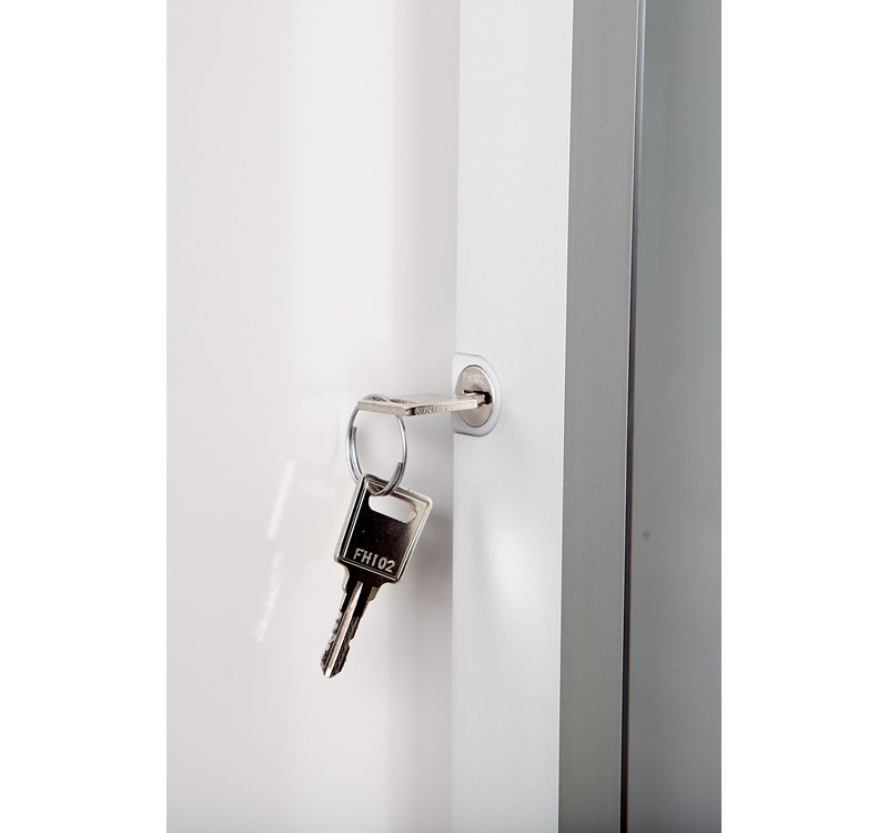 Porte battante en verre trempé sécurit (4 mm) ou en polyacrylate (3 mm). Verrouillage par une serrure située sur le côté, livrée avec 2 clefs.